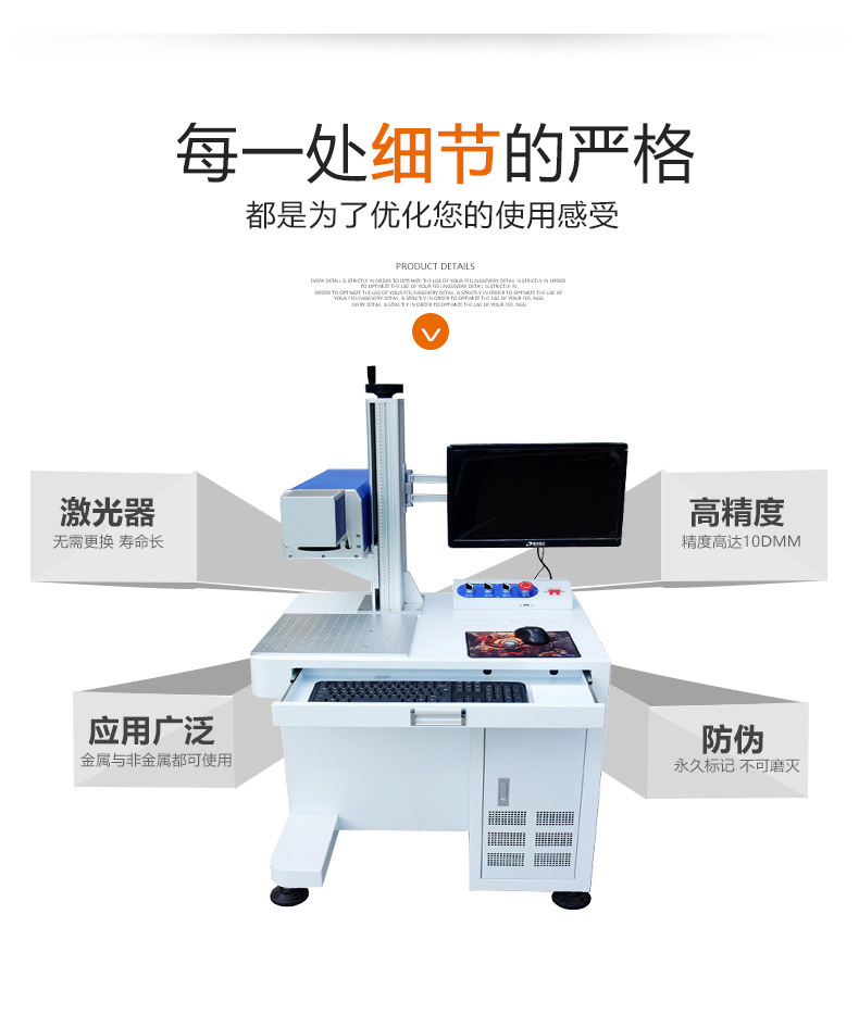 光纖激光打標機采用光纖激光器,振鏡掃描系統,輸出功率穩定,光學模式好,光束質量優異、打標速度快,效果好,效率高,能充分滿足客戶大批量生產需求。